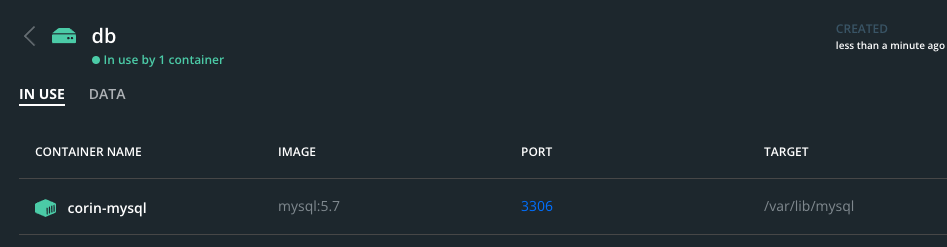$ docker run -d -v db:/var/lib/mysql --name corin-mysql -p 3306:3306 mysql:5.7