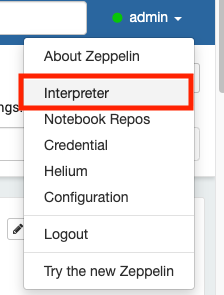 재기동 완료 후에 zeppelin 을 접속하여 인터프리터 관리 화면으로 이동 한다.