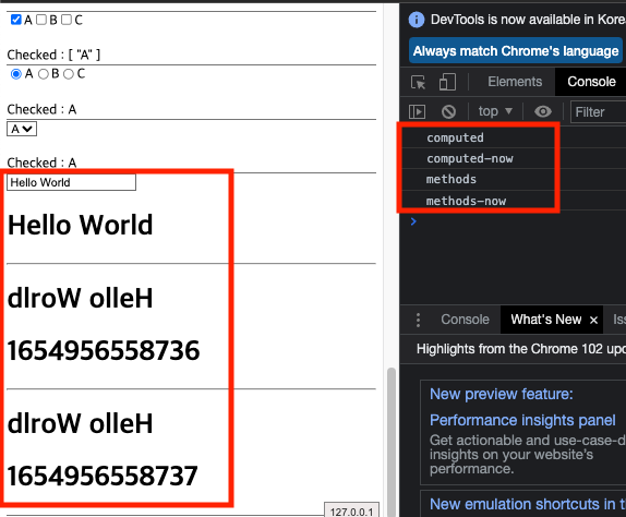 methods는 정의한 모든 함수가 실행되며 콘솔 로그를 보면 변경된 데이터와 관련없는 함수의 로그 'methods-now' 가 남은것을 볼 수 있다.