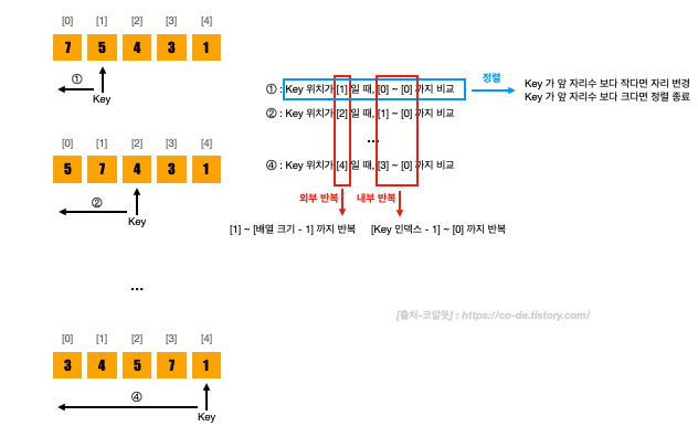 - 정렬 방법 : 두번째 자리(Index [1])부터 Key 값으로 지정후, Key 값 보다 앞자리 중 순서가 맞는 자리에 Key 값 삽입하여 정렬