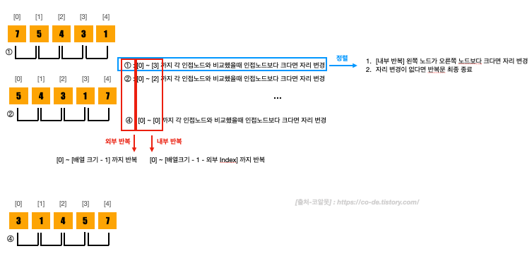 - 내부 반복 : [Index 0] ~ [Index (배열 크기 -1 - 외부 Index)] 까지 반복