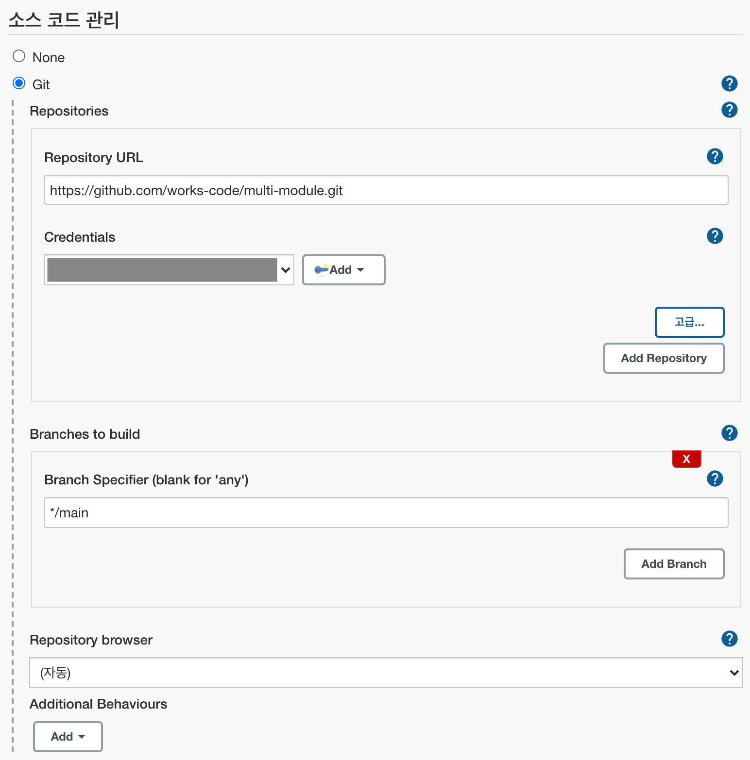 1. [젠킨스 서버] 젠킨스와 깃을 연동하여 해당 브랜치에 맞는 소스를 받아온다. (main 브랜치 소스를 가져온다.)
