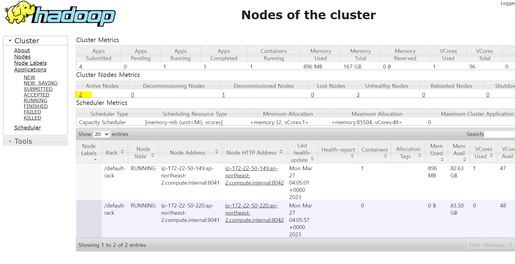 Yarn Nodes 를 보니 Active Node가 중간에 할당 받은 2대 노드 밖에 없는것을 볼 수 있으며