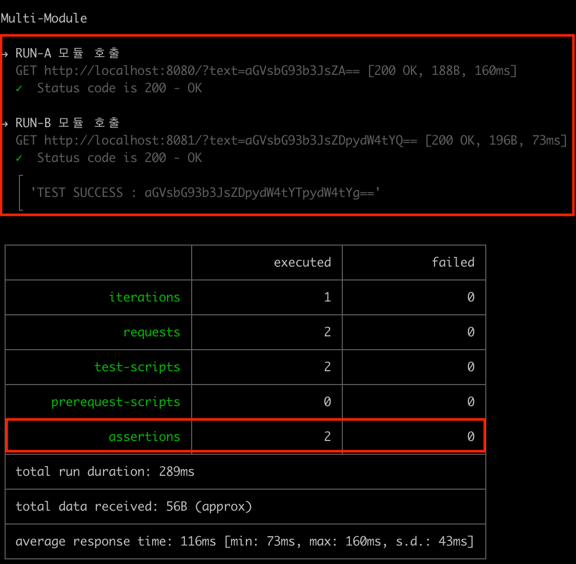 - 로그에 NewMan 테스트 했던 결과와 동일하게 로그가 나와 정상 실행 됐음을 확인 할 수 있다.