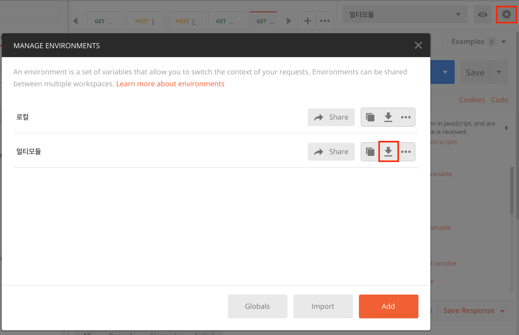- postman 으로 export 하여 json 파일로 내려 받는다.