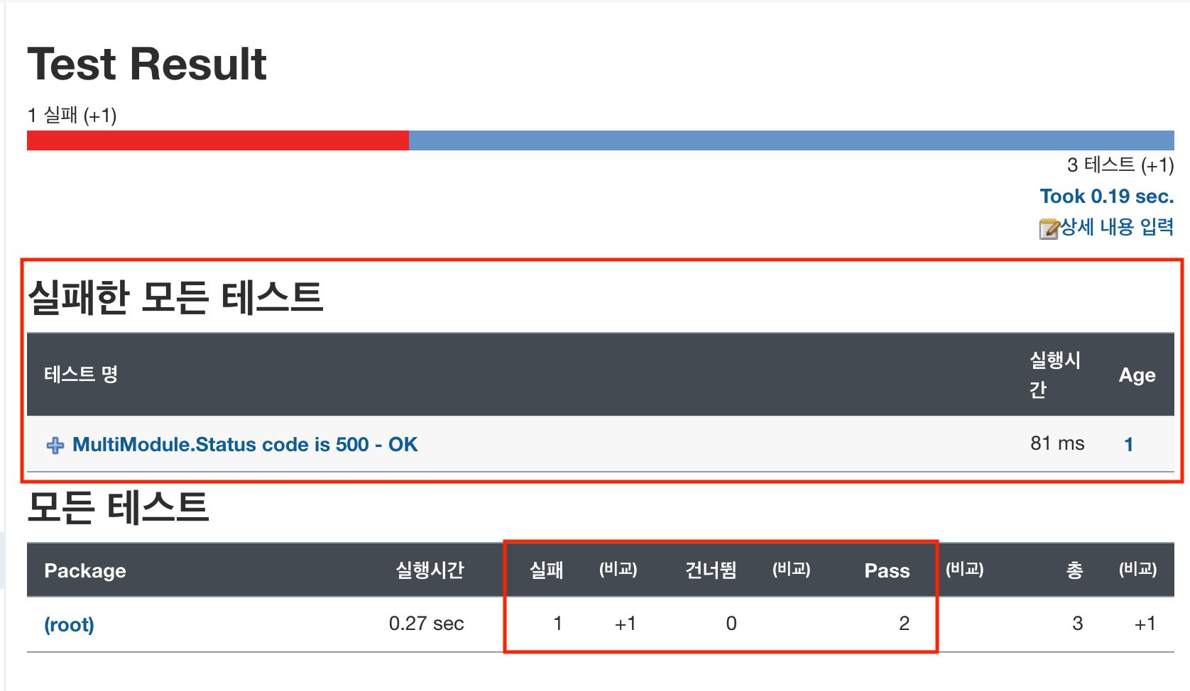 - 테스트 결과 확인시 3개의 테스트중 1개의 테스트가 실패 했다고 나온다.