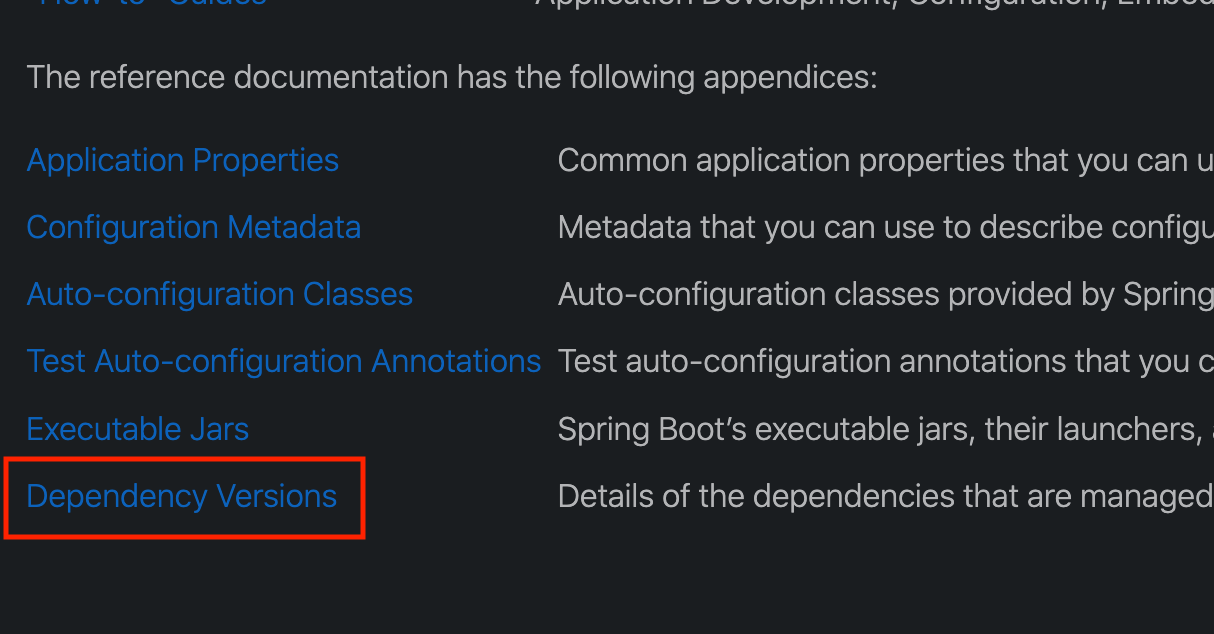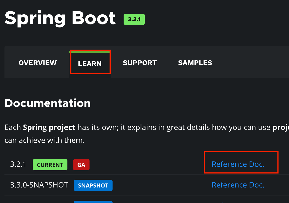다른 방법으로 버전 확인 하는 방법은 'Spring(https://spring.io/) 사이트 > 상단탭 Projects > Spring Boot > 설치한 버전 선택' 한 뒤에 아래와 같이 타고 들어가서