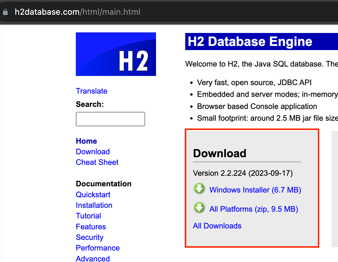 이제 H2 다운로드 사이트(https://h2database.com/)를 가서 맞는 버전을 설치 하고 용량을 보면 실제로 크지 않다.
