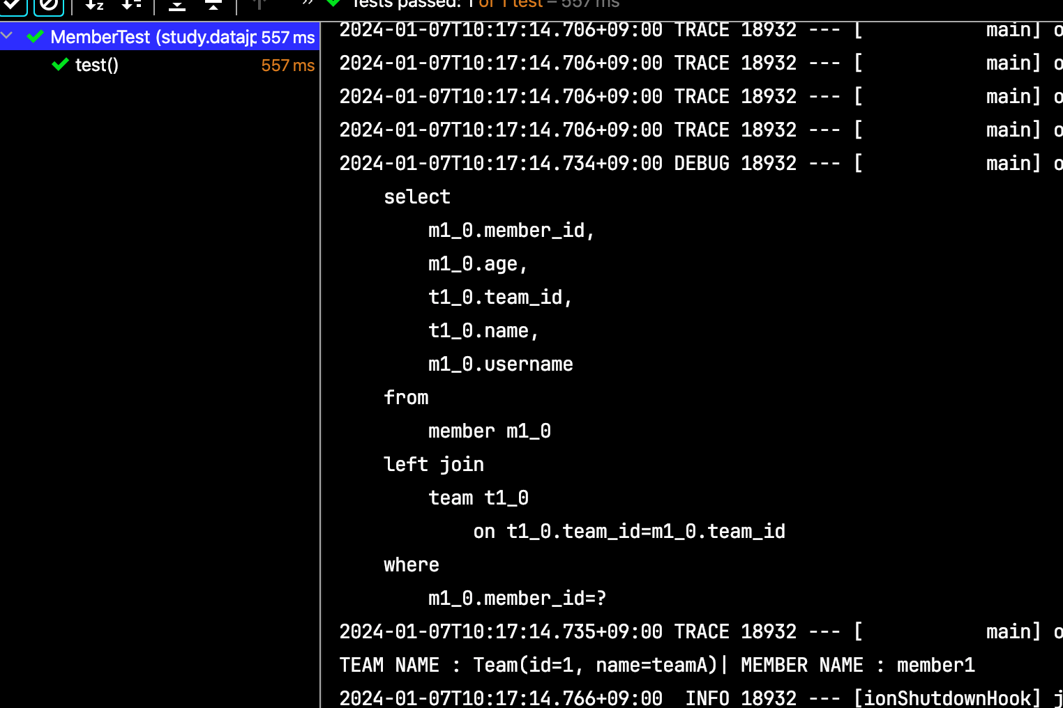 실행해보면 Member 만 조회한다는 정의 없이 사용하니 조인 쿼리로 한번에 나간다.