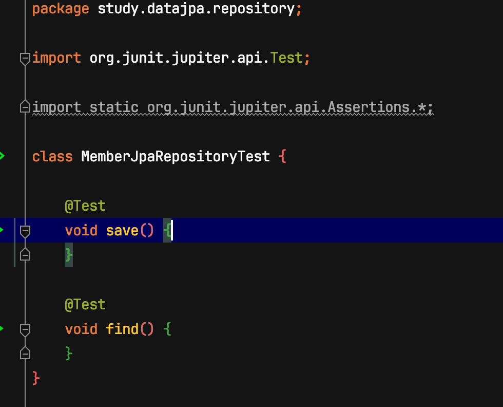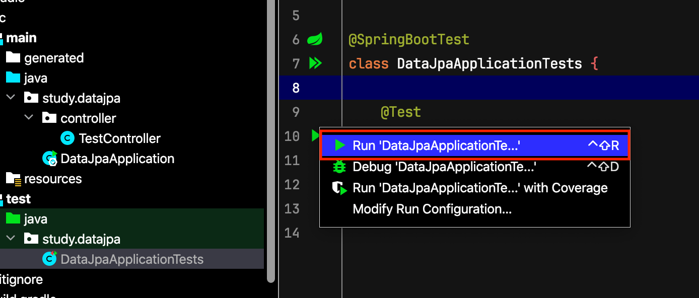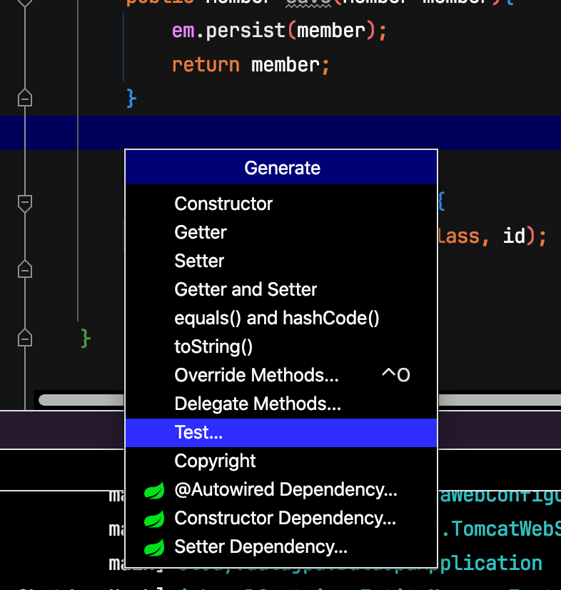 아래와 같이 mac 이라면 command+n 을 누른뒤 Test 코드를 자동 생성한다.