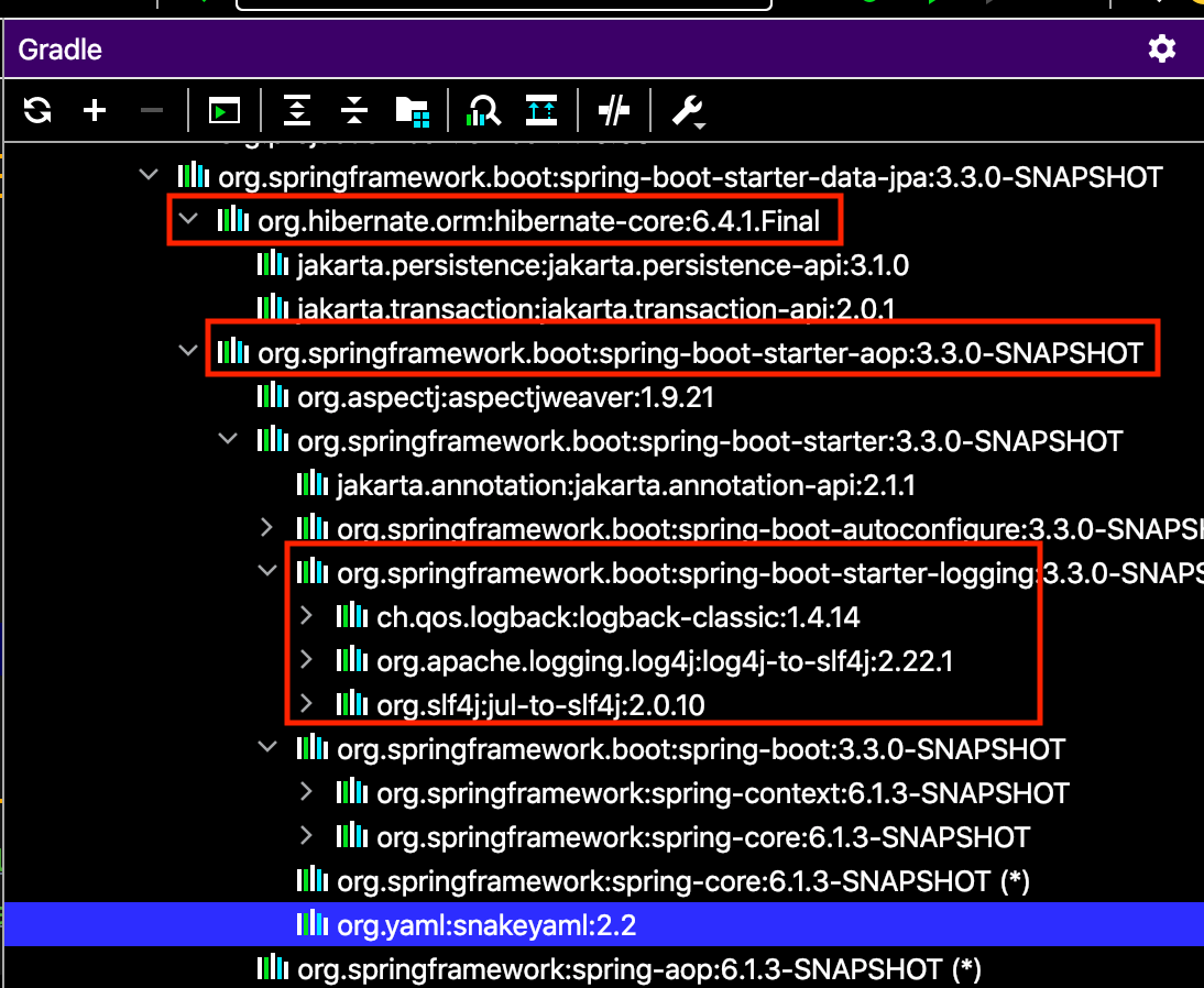 이제 사용하는 라이브러리중 JPA 의존성 라이브러리 보면 ORM 프레임 워크 hibernate, 로깅을 위한 sl4j 인터페이스에 log4j가 아닌 logback 구현체를 사용하며