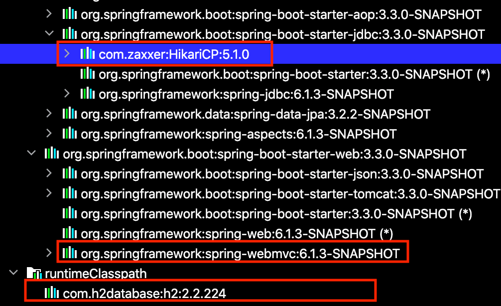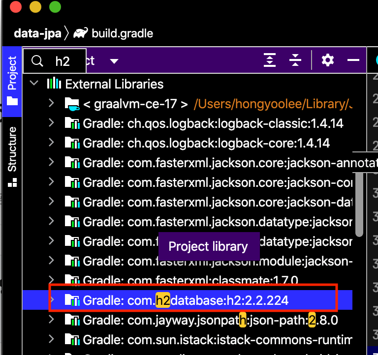 jdbc 컨넥션 풀 관리를 위해 HikariCP를 사용하고 spring webmvc 사용, h2 클라이언트 사용하는 것을 볼 수 있다.