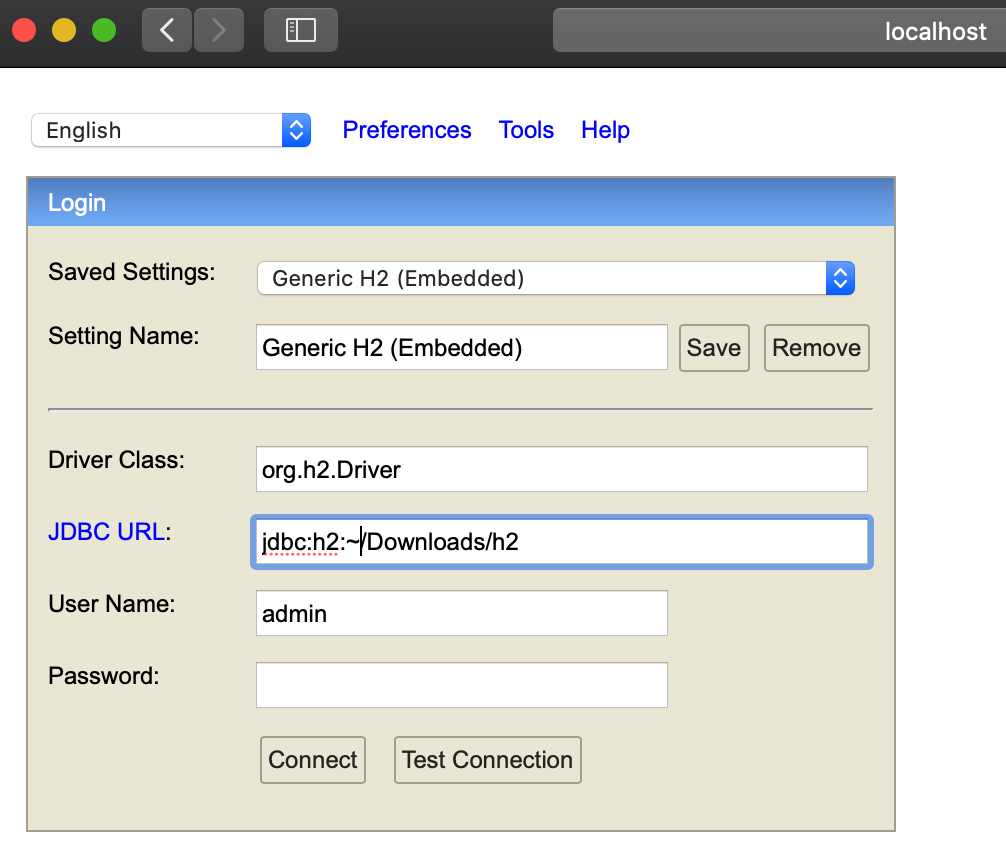 url: jdbc:h2:tcp//localhost/~/Downloads/h2 # connection url