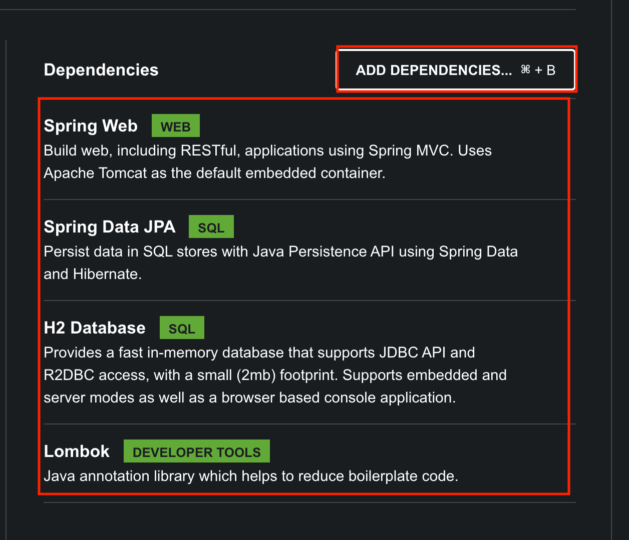 | Lombok | Getter Setter와 같은 반복된 코드를 쉽게 만들기 위함 |