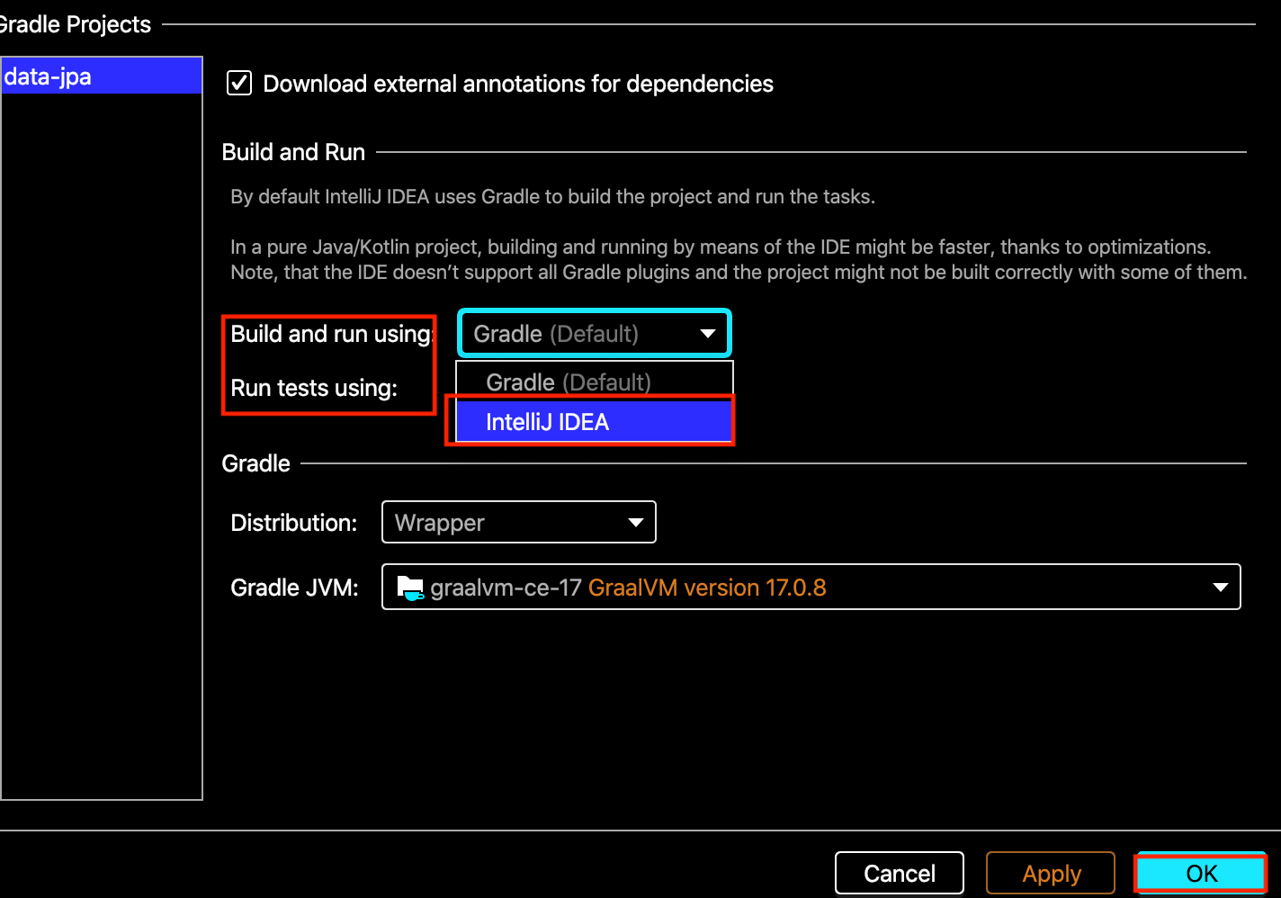 이는 Test 코드 실행시 Gradle 을 통해서 Test 코드를 실행 시키기 때문인데 바로 IntelliJ 에서 실행시키기 위해서는 설정을 아래와 같이 바꾸면 된다. 두개 설정 모두 IntelliJ 로 수정하면