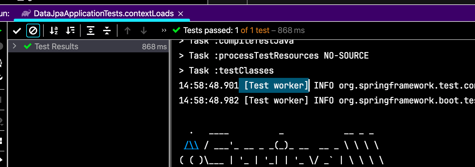 이제 Junit 을 이용하여 Test 를 진행하면 Test worker가 뜨고나서 좀 뒤에 테스트 코드가 실행된다.