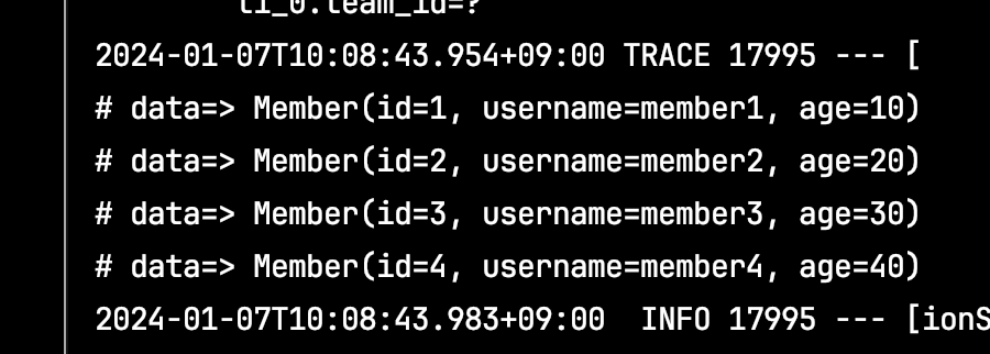 이 경우 Member 관련 데이터만 출력하며 Member Class 에 정의한 Team Class가 기본으로 EAGER 타입이므로 Team 테이블 데이터를 쓰지 않아도 불러온다.