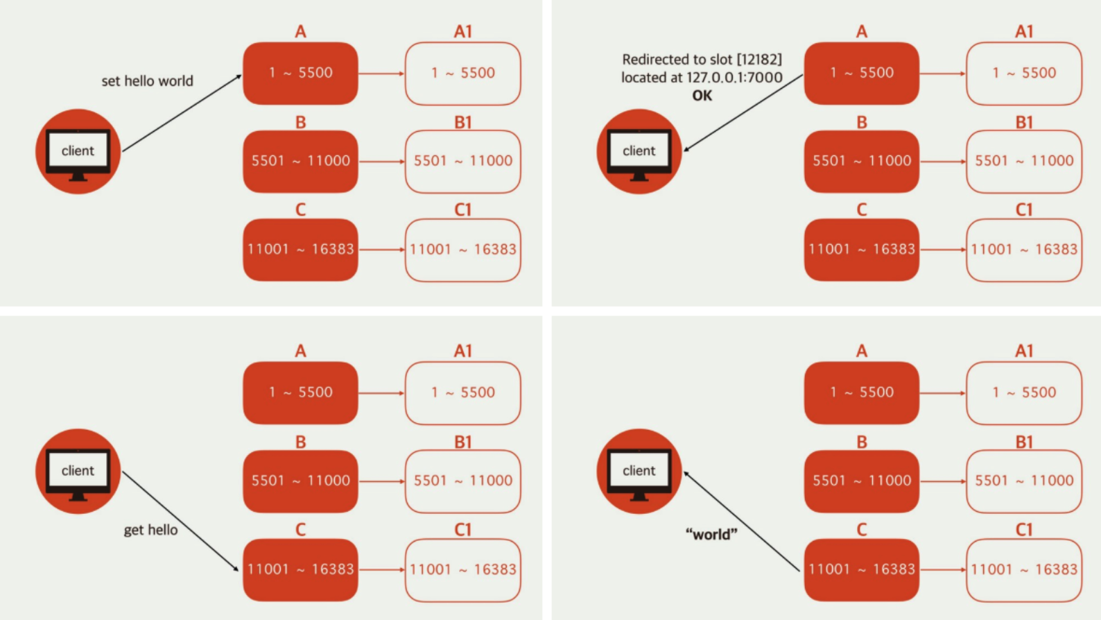 - master 1,2,3 이 있다면 데이터는 3개중에 하나에 저장되며, client 가 데이터 읽기 요청시 저장된 곳이 아닌 다른 마스터에 요청 했다면 저장된 마스터 정보를 알려주며, 클라이언트는 전달받은 마스터 정보에 다시 요청해서 데이터를 받아와야 한다.