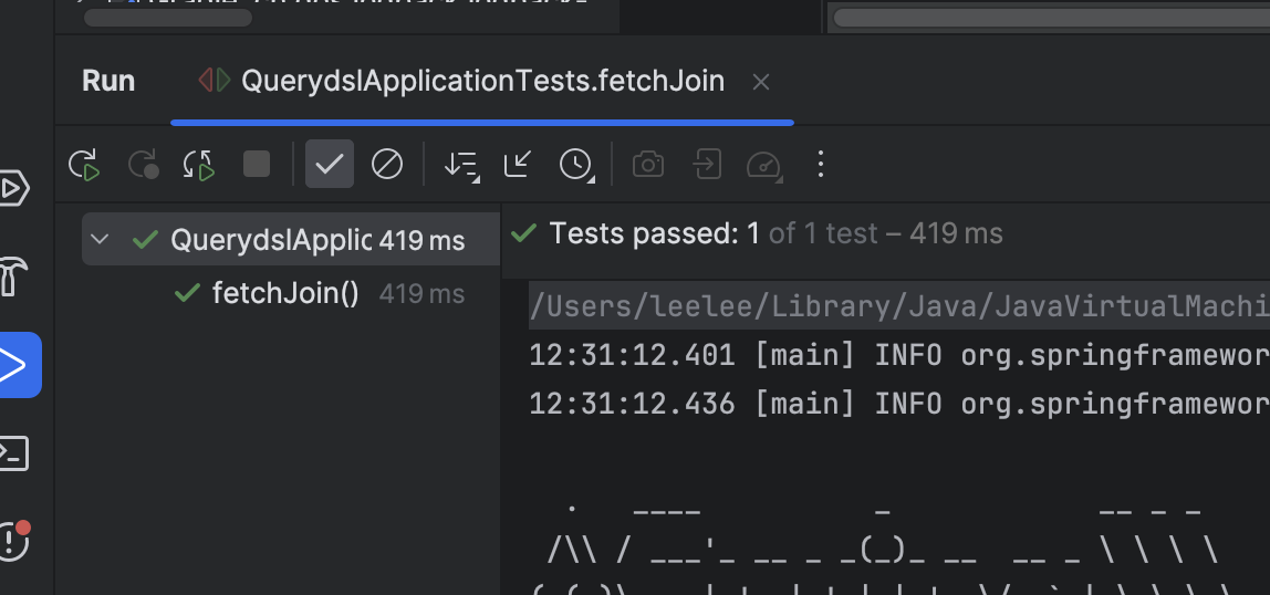 이제 위와 코드는 동일하게 하고 join 뒤에 fetchJoin() 을 붙이면 fetchjoin 으로 동작하여 team 엔티티도 불러오게 된다.