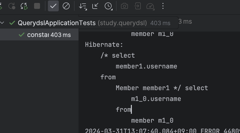 쿼리 날라가는것을 확인하면 JPQL, 실제쿼리 모두 'A' 를 쿼리로 호출 하지 않고 붙여주는것을 알 수 있다.