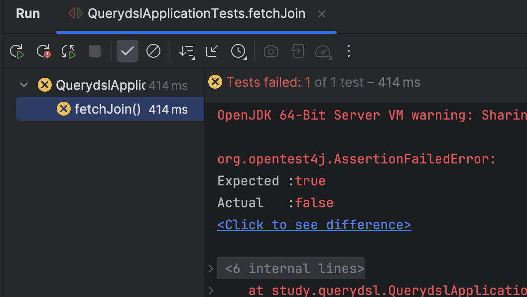 정상적으로 true 가 나와서 테스트에 실패한것을 볼 수 있다.(위와 다르게 assertFalse가 아닌 assertTrue인점 참고)