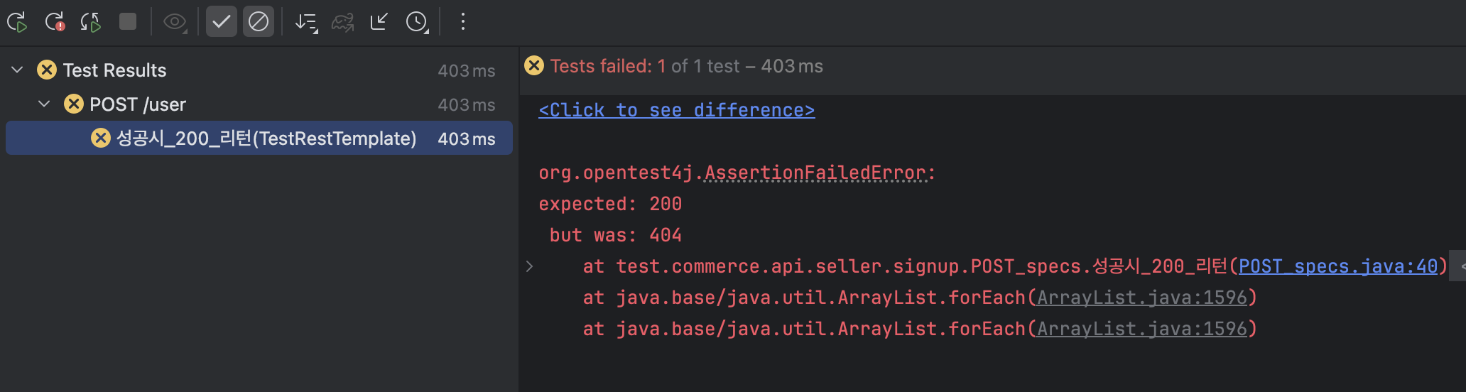 테스트 코드로 작성한 '상태 코드 200' 이기대한 값이지만 404로 나와 검증 실패 되었음을 알 수 있다!