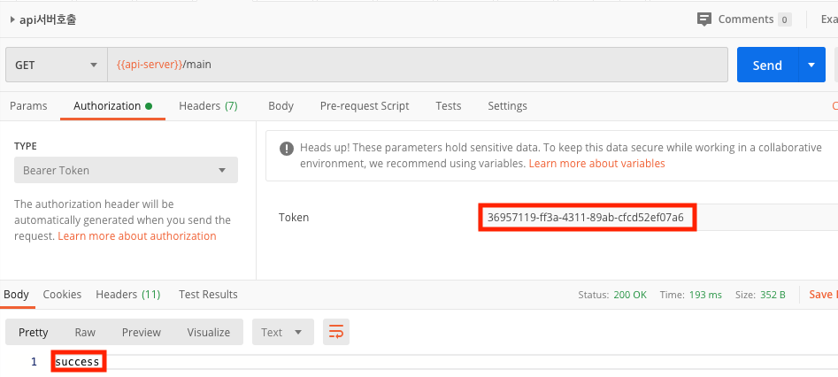 발행 받은 토큰으로 API를 호출하면 정상적으로 success 가 나온다.
