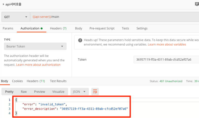 다시 얻은 토큰으로 API 호출 해보면 정상적으로 호출 되는것을 볼 수 있다.