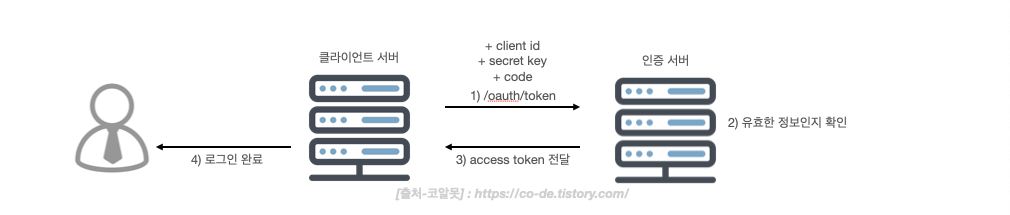 - Parameter : grant_type=code, authorization_code=발급받은코드, redirect_uri=코드 전달받은 URL