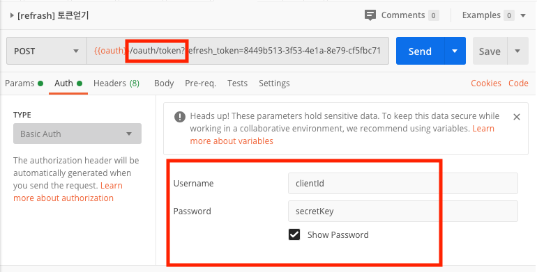 - clientid:secretkey 를 base64로 암호화 한 값을 Authorization 의 값으로 해더에 보낸다. (basic auth 라고 부르며 postman 에서는 아래와 같이 입력시 알아서 해줌)