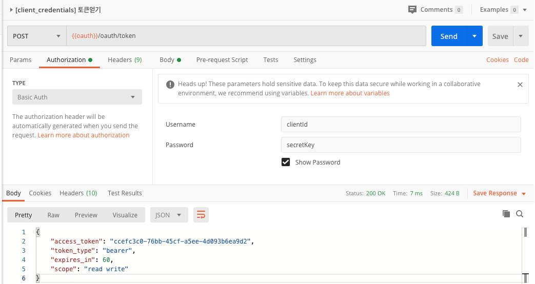 - Parameter : grant_type=password, username=아이디, password=패스워드, scope=read