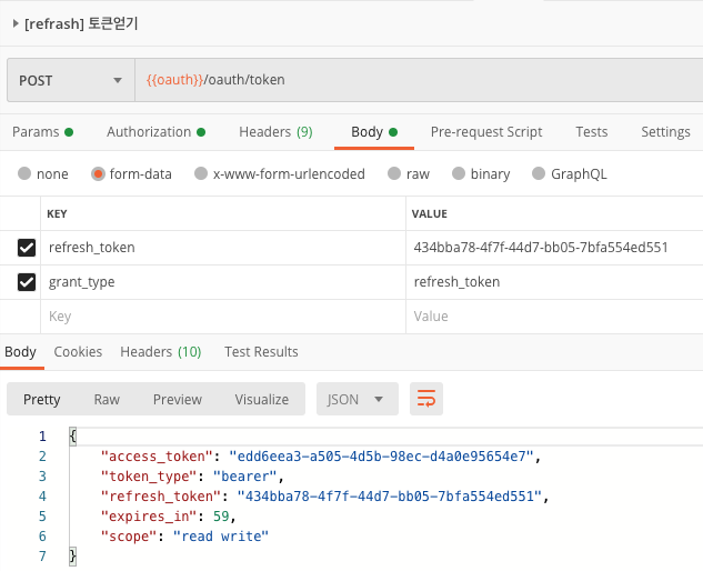 - Parameter : grant_type=refresh_token, refresh_token=이전에 발급받은 refresh token, scope=read