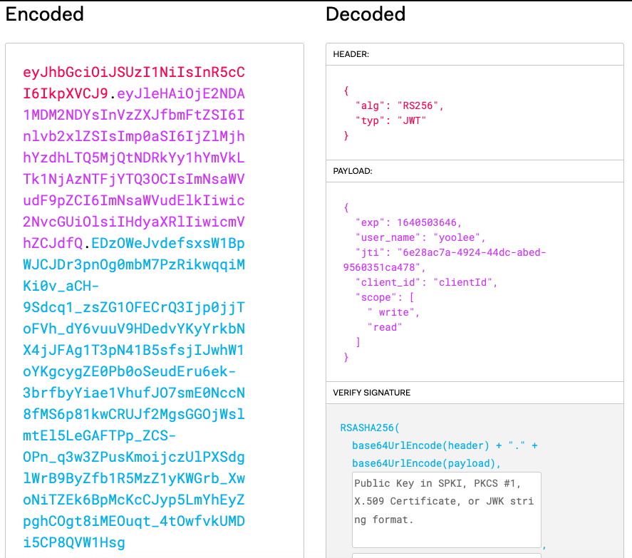 jwt 토큰 해당 사이트(https://jwt.io/)에서 인코드 된 값을 확인할 수 있다.
