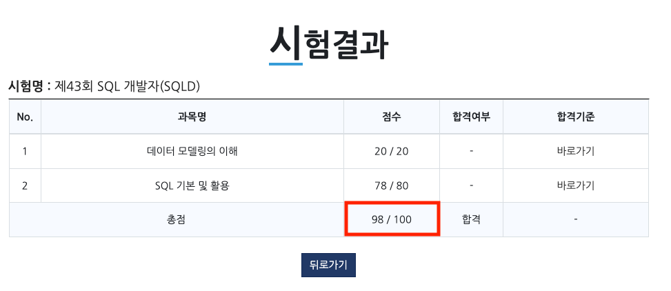 총 점수가 60점 이상이면 합격이고 과목별 40% 미만 취득시(데이터 모델링의 이해 > 과락 : 8점 미만, SQL 기본 및 활용 > 과락 : 32점 미만) 과락으로 불합격이다!