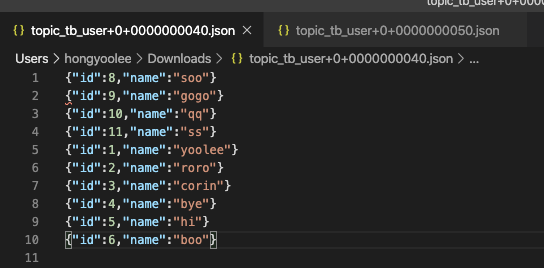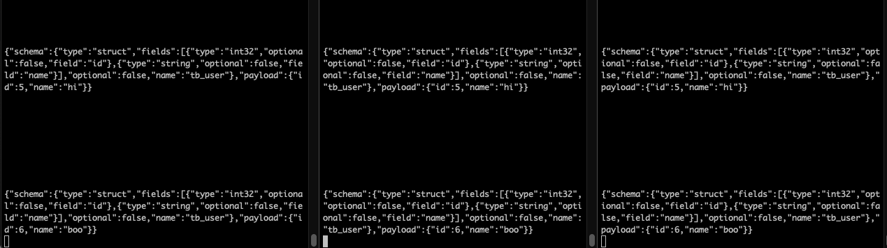 $ ./kafka-console-consumer.sh --bootstrap-server kafka-01:9092,kafka-02:9092,kafka-03:9092 --topic opic-tb_user-tb_user --from-beginning