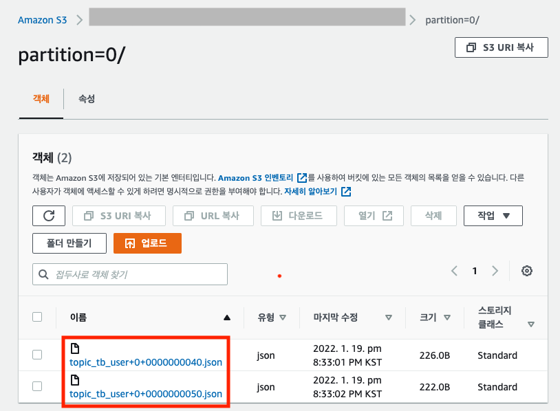 버킷/디렉토리/토픽명/파티션번호 안에 데이터가 만들어졌다.