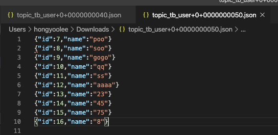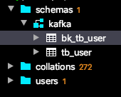 이제 테스트를 진행해본다! 소스 컨넥터에 mode를 incrementing으로 했기에 소스 컨넥터를 만든 시점 이후 증가되는(증가 기준을 id 칼럼으로 설정 함) 시점에 데이터를 추가하도록 되어있다. 해당 테이블에 데이터를 넣어서 실시간으로 데이터가 신규 테이블(bk_tb_user) 에 넣어지는지 본다.