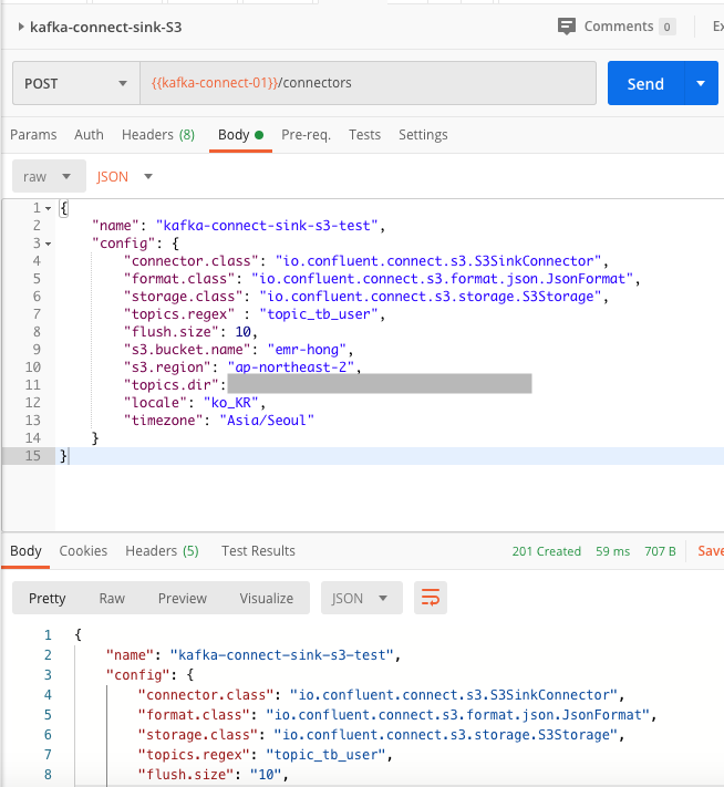 정상적으로 연결 되었다면 이제 해당 토픽을 받아 처리할 sink 컨넥터를 만든다.