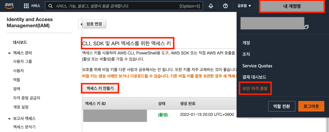 우선 aws 키는 aws 사이트에서 아래 내 계정명 클릭 > 보안 자격 증명 > 엑세스 키 만들기를 통해 발급 받는다.