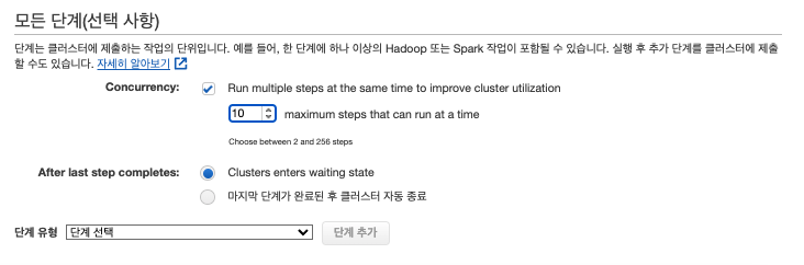 | 단계 유형 | 클러스터 생성 시점에 단계를 추가하여 미리 만들어 둘 수 있다. | |||