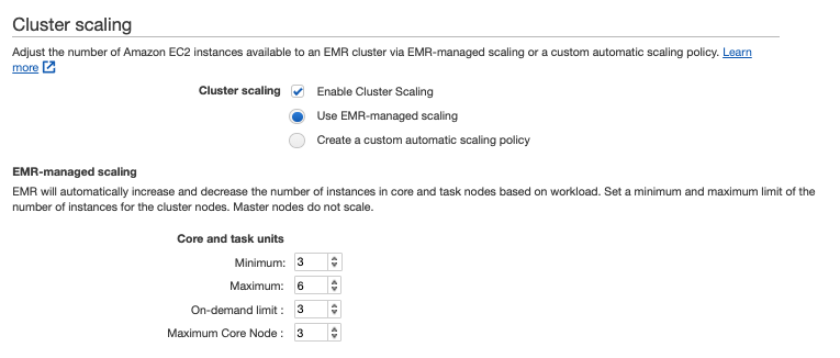 | EMR 관리형 확장 | 최저한의 : 최소 코어+작업 노드수 최고 : 최대 코어+작업 노드수 on-demand 제한 : 온디맨드 수 제한 최대 코어 노드 : 최대 코어 노드 수 제한 |