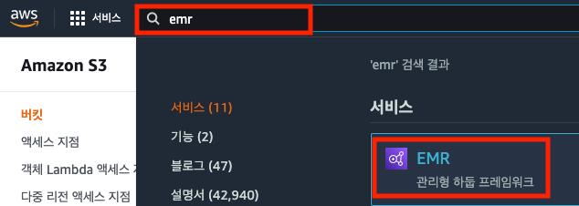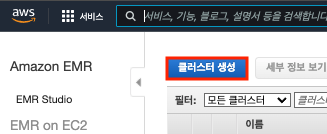 우선 AWS 콘솔에 접속 하여 emr 을 검색 한다.