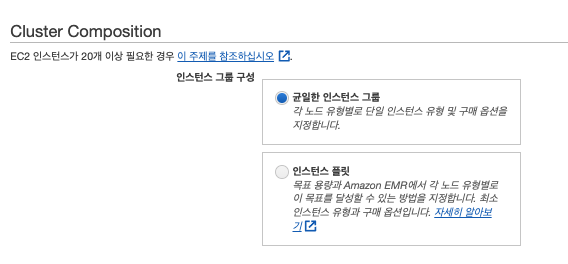 인스턴스 플릿 일때만 활성화 되는 화면으로 우리는 균일한 인스턴스 그룹을 사용하며 넘어간다. |