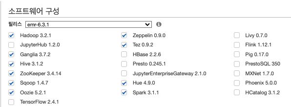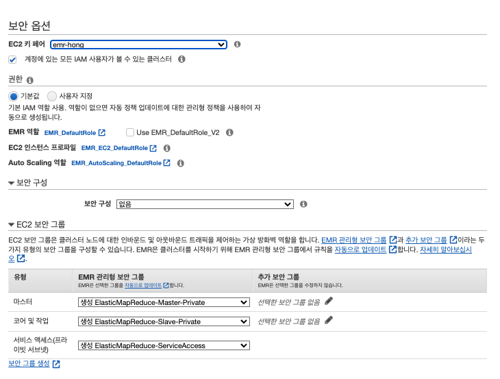 | 설명 | EC2 키 페어 - ec2 에 접속하기 위해 필요한 보안 키 파일 (.pem) 계정에 있는 모든 IAM 사용자가 볼 수 있는 클러스터 체크하여 다른 사용자도 해당 emr 클러스터를 볼수있도록 함 ec2 보안 그룹 -각 서비스별 방화벽 설정 선택 |