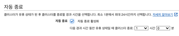 | 설명 | x시간 동안 사용 하지 않으면 자동으로 클러스터 종료하도록 설정 | |||