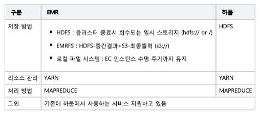 기존 하둡과 비교하면 아마존 하둡인 EMRFS는 저장소를 S3에 저장할 수 있다는 점이 다르며 아마존의 서비스를 적극적으로 활용할 수 있다.