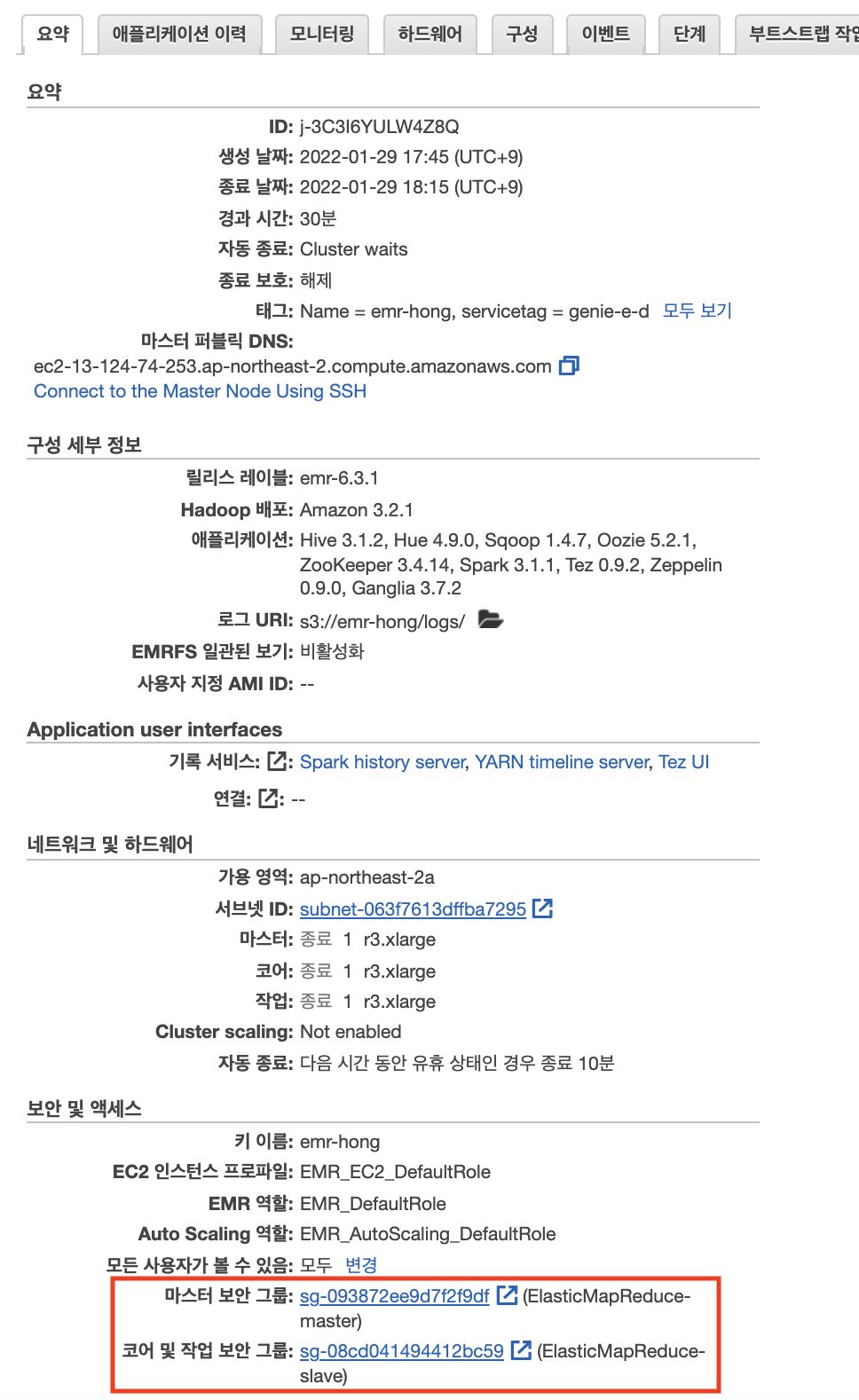 $ ssh -i emr-hong.pem hadoop@ec2-3-34-145-134.ap-northeast-2.compute.amazonaws.com