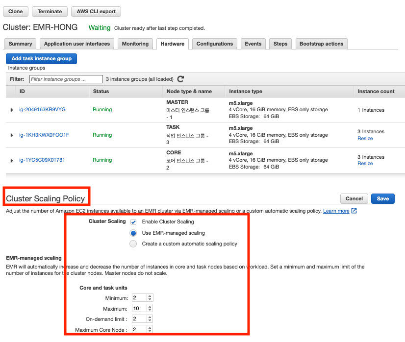 AWS > 콘솔에 로그인 > 클러스터 목록 > 클러스터 선택 > 하드웨어 탭 > 클러스터 스케일링 정책 > Edit
