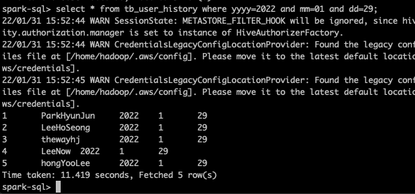 4번 클러스터의 경우 로컬 maria db에 있는 hive 메타 스토어의 데이터를 정상적으로 가져온다. 설정하지 않아도 클러스터 구성시 spark 에서 sql 접속시 hive matastore 연결 되도록 기본 설정 되어있다. (참고사항 참조)