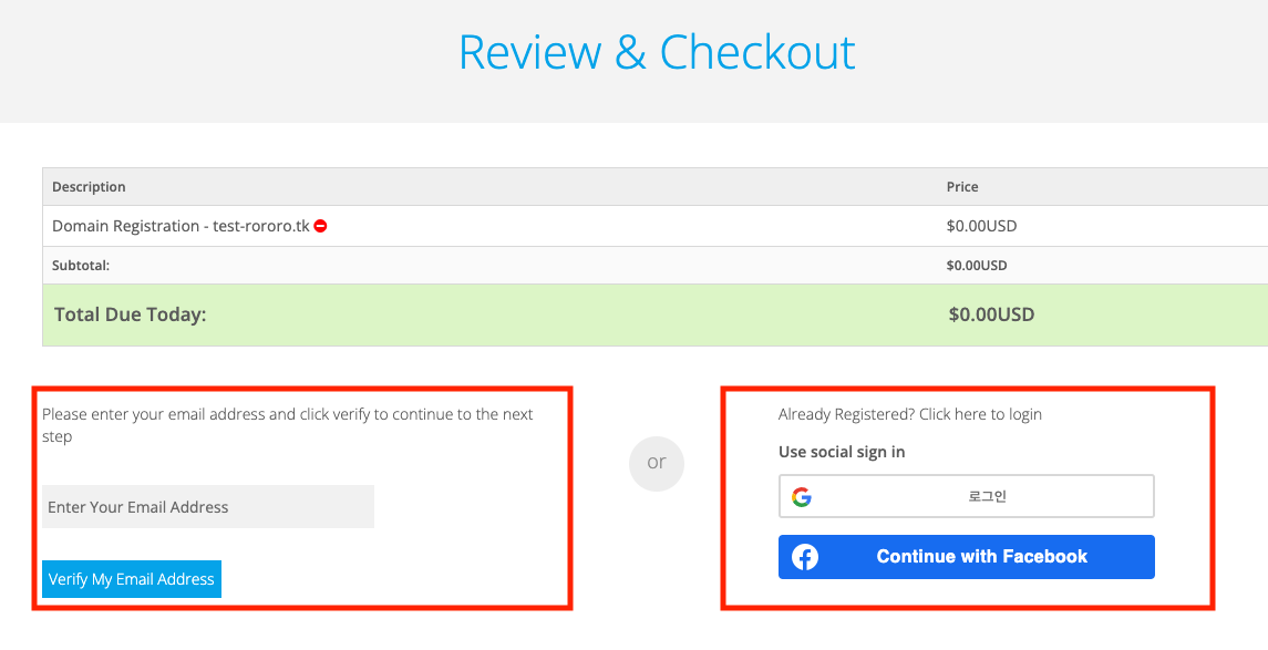 checkout 을 누르면 도메인 사용 유효기간을 정할 수 있는데 무료는 최대 1년 으로 원하는 유효기간을 설정한다.